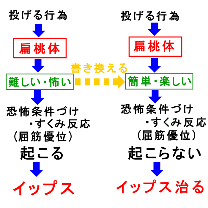 どのスポーツのイップスでも同じですが失敗することや過度のプレッシャーや緊張状態を経験することで、その動作が負(-)の記憶(恐怖や不安)として脳の扁桃体に残ることがあります。次に同じ動作をしようとした時、扁桃体に記憶された負(-)の記憶を投影して現在を見てしまうので、過度の緊張状態を作り体の屈筋が収縮して思うようにプレー出来なくなるのがイップスです。
