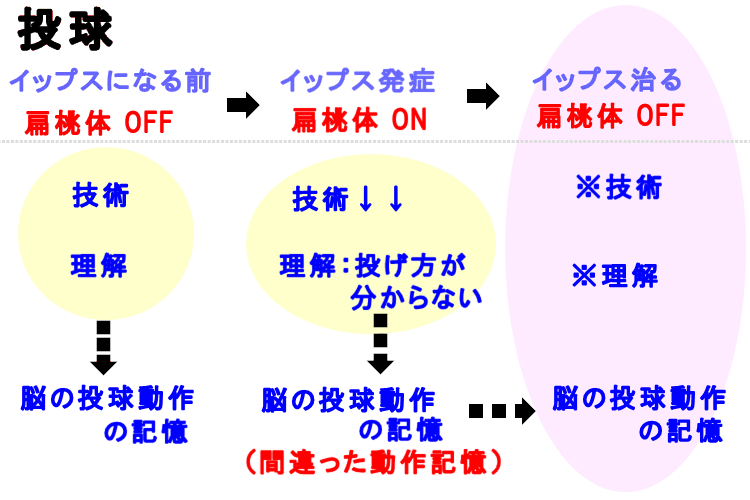 イップスとは、ネガティブな体験をしたことによって、心に出来たシコリやシミのような物が動きの邪魔をしてしまう。