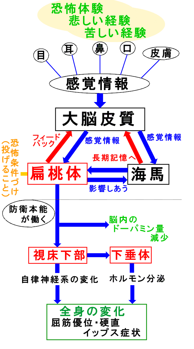 イップスは、いつ起きるのか?ある研究機関の実験を引用させて頂きます。恐怖条件づけ・すくみ(恐怖)反応の実験結果です。マウスに対してブザー音の後に電気ショックを行った。これを何度か繰り返すとマウスはブザー音が聞こえたら、すくみ(恐怖)反応を示すようになる。恐怖条件づけ・すくみ(恐怖)反応の強さは繰り返すたびに増加する。これは、ブザー音の後に電気ショックが来るということを予測し身構え防御態勢をとっていることの表れです。恐怖条件づけ・すくみ(恐怖)反応は魚類、マウス、人間といった多くの生物で認められる普遍的な現象のようです。