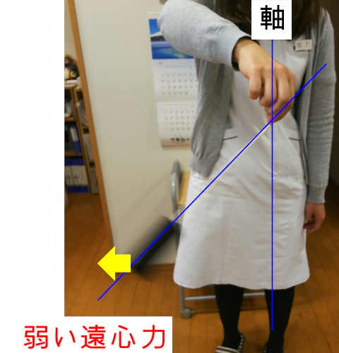 オーバースローの場合は、踏み出した足の方に体幹軸を傾けます。そのこと以外はサイドスローの場合と全く同じです。正しいオーバースローの投げ方は腕を上げているのではなく体幹軸自体が踏み出した足の方に傾くから結果的に腕が上がっているように見えるのです。あくまでも遠心力は体幹軸から腕が離れようとする力で体幹軸と上腕軸の関係は直角になります。(遠心力は黄色矢印の方向)